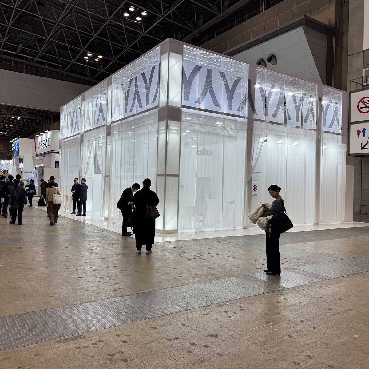 千布の中、ヴェールに包まれた新商品の数々。これらの興味を引きつけるようないくつかの箱形の空間が布の中に広がります。白く潔い空間は、展示されている商品を引き立てます。