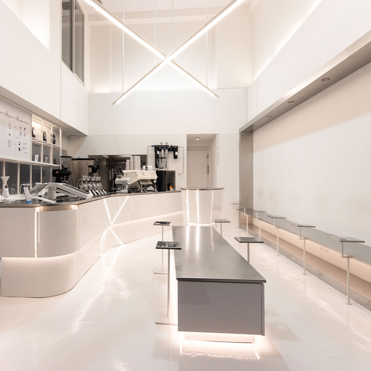 森彦ブランドが「カルチャー」だとすれば、JBブランドは「ファッション」とオーナーの市川氏。そのファッションたる空間デザインを担当しました。革新的なIOTコーヒーマシンと潔い真っ白な空間がマッチしており、ブランドストーリー全体を語れるショップデザインに仕上がりました。
